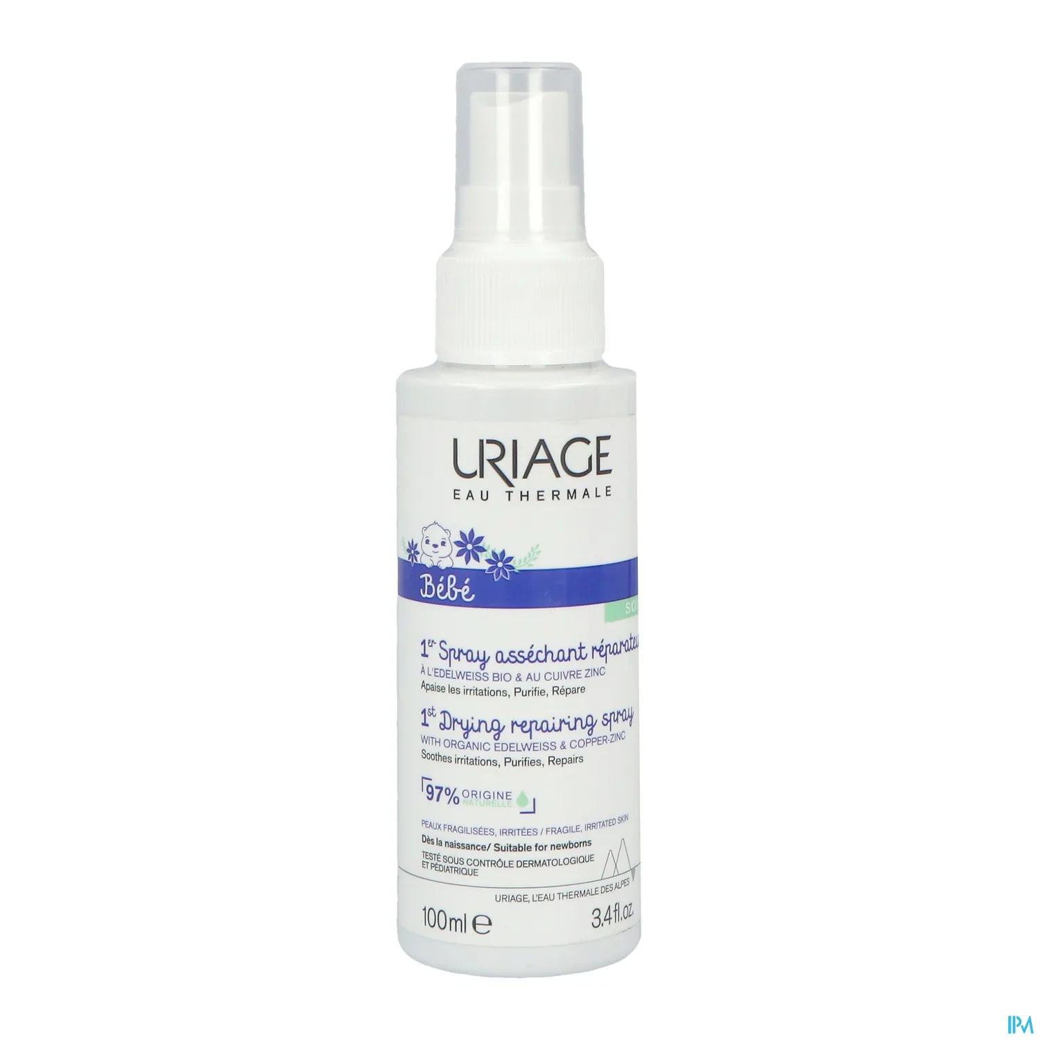 Drying and repairing spray for fragile infant skin, formulated to dry weeping areas and promote skin repair without irritation. Its high-tolerance formula combines a Cu-Zn complex to dry and purify the affected area and organic edelweiss extract to soothe. Packaged in a practical 100 ml no-rinse spray, it allows for quick application to skin folds, the diaper area, or macerated areas, respecting the delicacy of baby's skin.