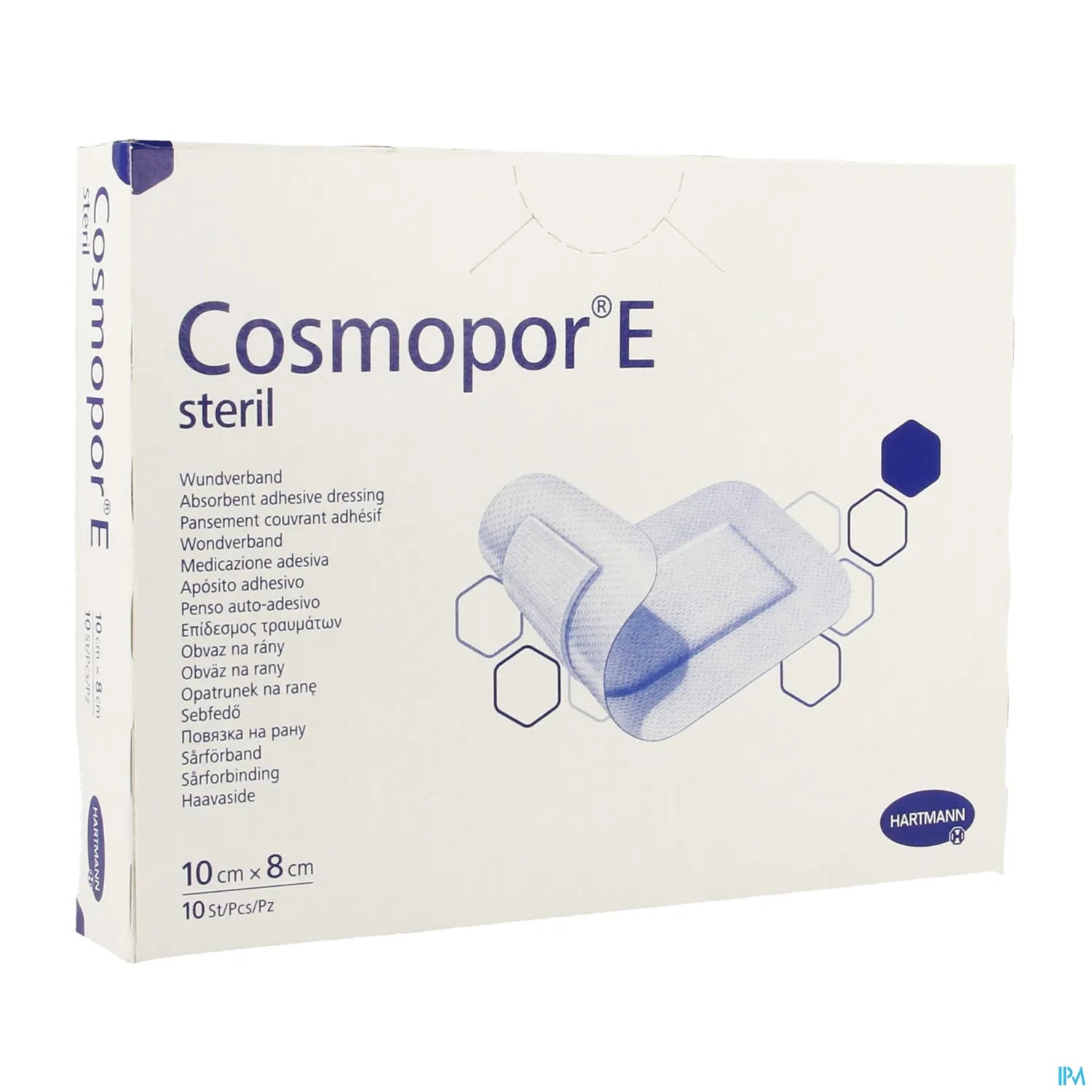 Hartmann. Pansement stérile absorbant et autoadhésif destiné à protéger et couvrir la plaie. Coussinet en pur coton et masse adhésive en polyacrylate sans latex. Boîte de 10 pansements 10x8 cm.