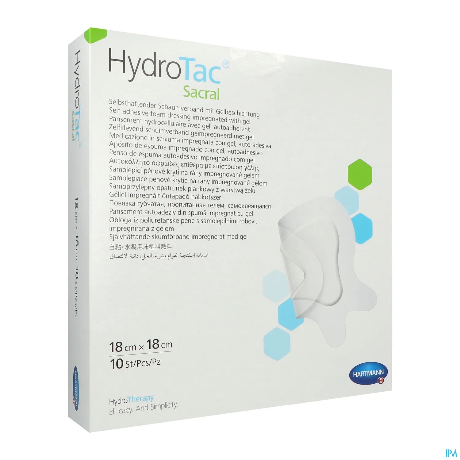 HARTMANN. Pansement sacral adhésif hydrocellulaire conçu pour la prise en charge des plaies en milieu humide. Conception adaptée à la région lombosacrée pour un bon maintien et confort. Boîte de 10 pansements de 18 x 18 cm.