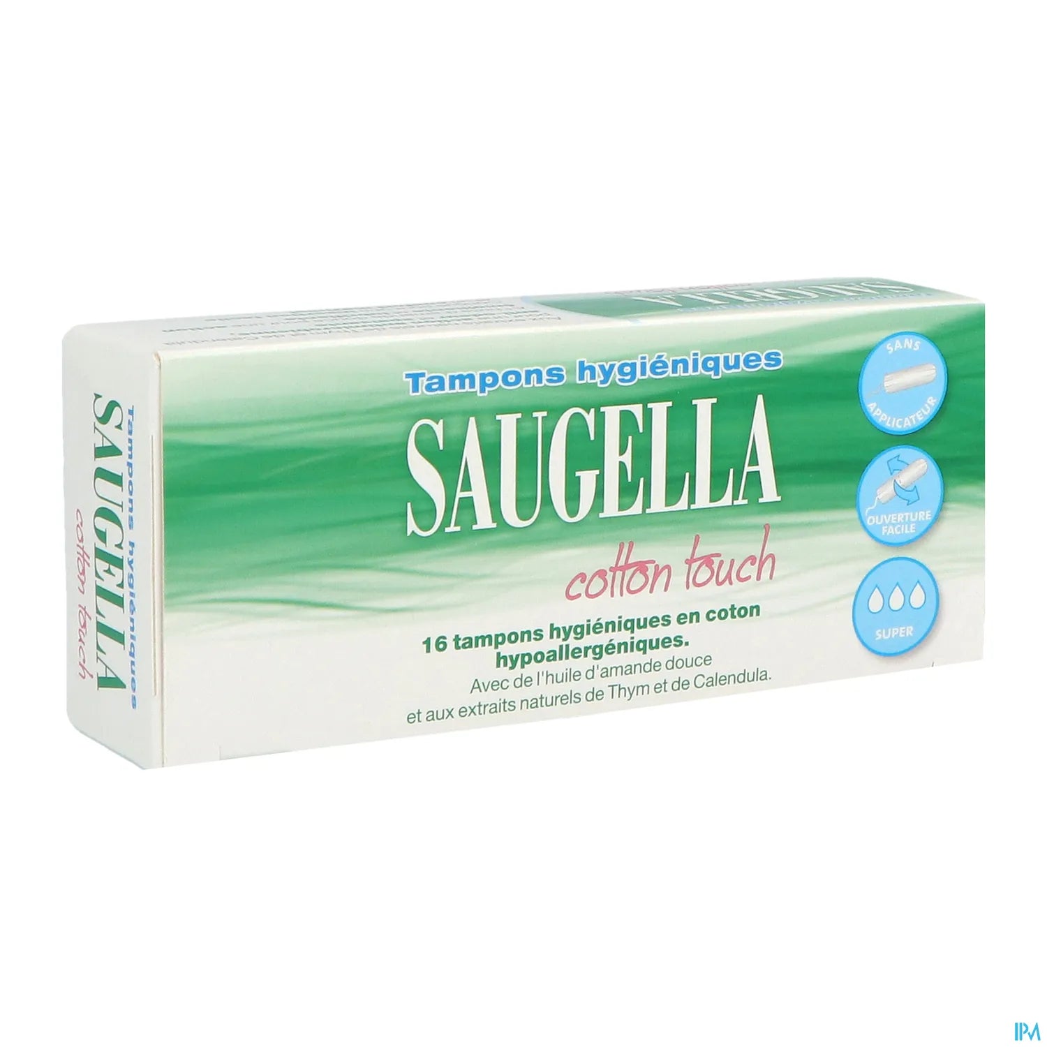 Saugella. Tampons hygiéniques Super en coton aux extraits naturels de thym et de calendula. Hypoallergéniques, ils offrent une action antimicrobienne, anti-odeur et apaisante. Conçus pour apporter confort et protection pendant les règles.