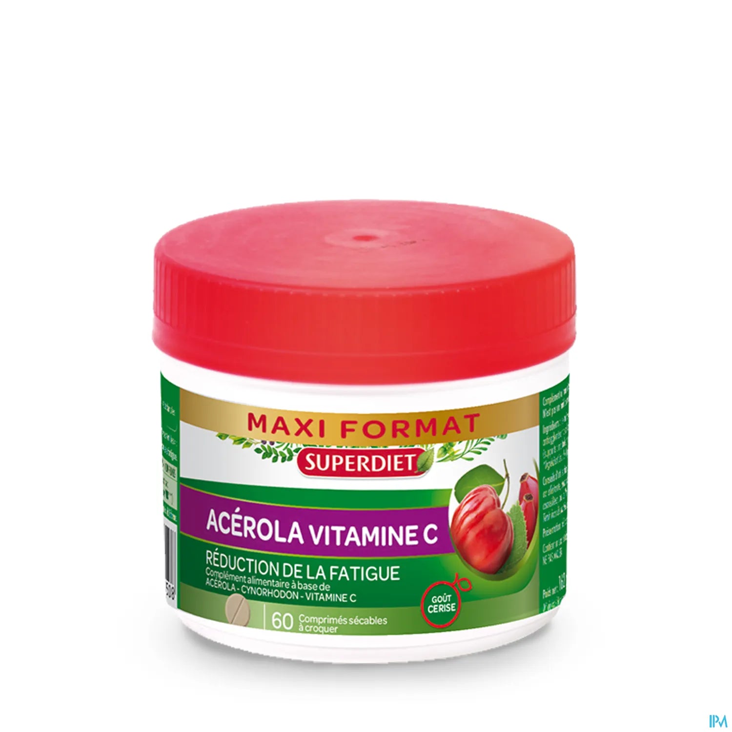Superdiet propose des comprimés sécables à croquer à base d'acérola et de cynorrhodon. Ces fruits ont été sélectionnés pour leur teneur naturelle en vitamine C. Format pot 90 comprimés.